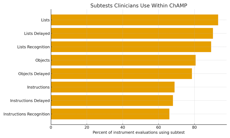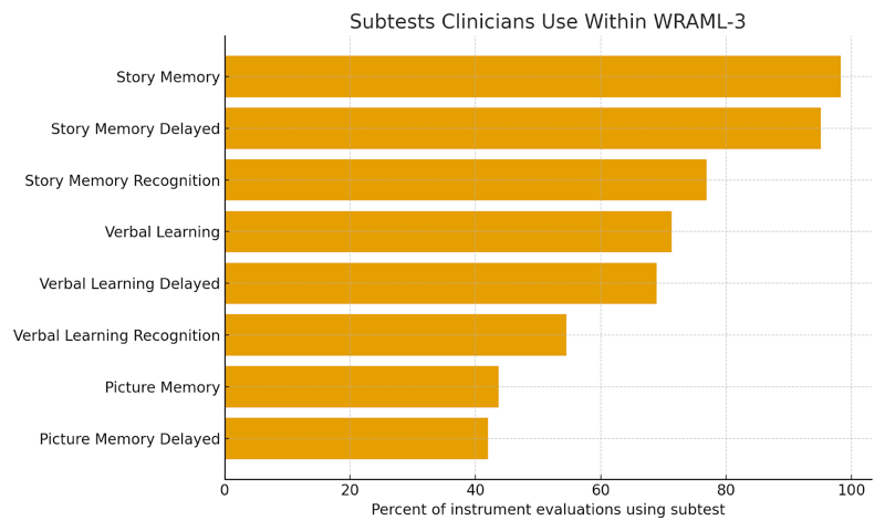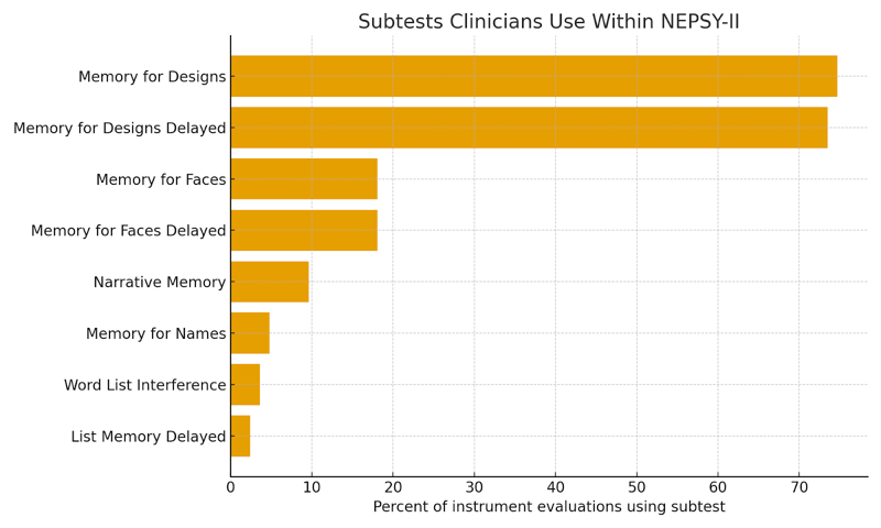 Even within a given instrument, clinicians rarely use every available memory subtest equally. Instead, a small subset tends to carry most of the testing time. To illustrate this, we looked at the subtest profile for the five most commonly used instruments in this dataset.