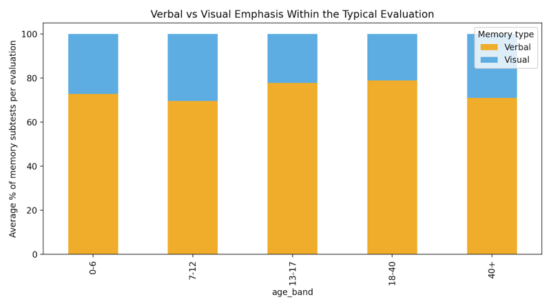 Performance tests were decomposed into individual subtests and tagged as primarily verbal or visual based on the dominant input and output format. We then examined memory coverage at two levels: within age bands (population-level sampling) and within the typical evaluation (case-level emphasis).