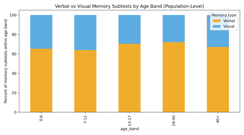Looking across all administered memory subtests, about 67% of memory tasks are verbal and 33% are visual. That verbal tilt is present in every age band, but it becomes more pronounced in adolescence and adulthood, where list-learning and story-based tasks are especially common.