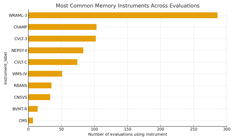 In this sample, WRAML-3 is the single most common memory instrument, appearing in 286 evaluations. ChAMP, CVLT-3, NEPSY-II, and CVLT-C round out the next four spots. Together, these five tools account for a substantial proportion of all memory modules administered on neuroaide, functioning as de facto anchors in everyday practice.